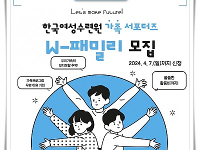 "행복한 가족, 잊지 못할 추억 만들기"... 4월 7일 [일]까지, 전국의 가족이라면 누구나 지원 가능... (재)한국여성수련원(원장 함영이)이 내달 4월 7일(일)까지 홍보 채널의 다양화를 위한 가족 서포터즈 「W-패밀리」1기를 모집한다. 가족 서포터즈「W-패밀리」는 전국의 가족이라면 지역, 연령, 인원과 관계 없이 누구나 신청 가능하며, (재)한국여성…